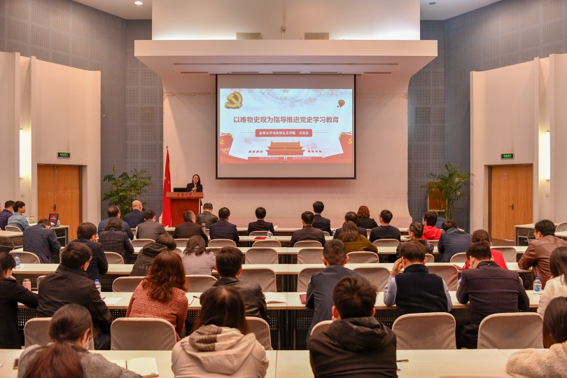 宣讲团成立仪式后,上海市委讲师团党史学习教育专家宣讲团成员、学校党史学习教育专家宣讲团成员、马克思主义学院院长王治东教授作首场宣讲报告,从以唯物史观推进党史学习的重要意义、围绕时代之问探讨时代的核心要义、抓住历史主体划定历史的时空边界、正视社会规律把握社会的发展路径等方面,帮助党员、干部和师生坚持以唯物史观为指导推进党史学习。