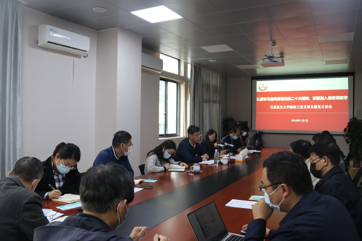 活动中,马克思主义学院党政班子成员就落实学校党委关于学习宣传贯彻党的二十大精神部署任务,认真组织开展好学习研讨,做好理论研究阐释和宣讲,及时根据课程教学任务目标和大纲,将党的二十大精神融入思政课教学的具体举措进行了交流。各教研室骨干和教师代表就党的二十大精神有机融入各门思政课进行交流,提出要引导学生读原文、悟原理,“全貌式”把握党的二十大精神。大家表示要进一步增强宣讲党的二十大精神的使命与责任意识,“带着感情去讲”,切实将党的二十大精神贯彻落实到思政课教学全过程。