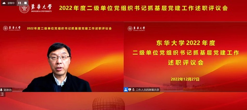 刘承功逐一点评并讲话,对全校各二级单位党组织认真履行管党治党主体责任,狠抓基层党建工作落实,抢抓机遇,攻坚克难,特别是各级党组织和广大党员在疫情“大考”中,践行初心使命,充分发挥作用,推动形成以高质量党建引领高质量发展的“奋进”新格局给予肯定。他指出,2023年是全面贯彻落实党的二十大精神的开局之年,是实施“十四五”规划的又一个关键之年,学校各级党组织要立足全面学习贯彻党的二十大精神,深化构建与学校高质量创新发展相适应的“大党建”工作格局。他强调,要突出政治引领,强化政治功能,持续全面学习贯彻党的二十大精神,落实“学思用”贯通机制,切实把学习成果转化为抓班子带队伍、统筹推进干部和人才队伍建设、推动中心工作、提高治理效能等方面的思路举措和进展成效;要融入中心大局,增强组织功能,以《中国共产党普通高等学校基层组织工作条例》为遵循,以本轮创建“上海党建工作特色高校”为载体,实施“铸魂·治学育人”“引领·党建创优”“融合·创新发展”三项“奋进计划”,全面推进二级单位党组织和基层党支部夯实基础、特色攻坚、辐射带动、发挥作用,以高质量党建引领各项事业高质量创新发展;要深化责任落实,提高政治能力,进一步筑牢“两个体系”,创新“五类示范”,想在前头、干在前沿、走在前列,比学赶超,对标争先,不断提升服务国家重大战略和区域经济社会发展的能力和水平,在新时代新征程奋力谱写“奋进东华”崭新篇章。